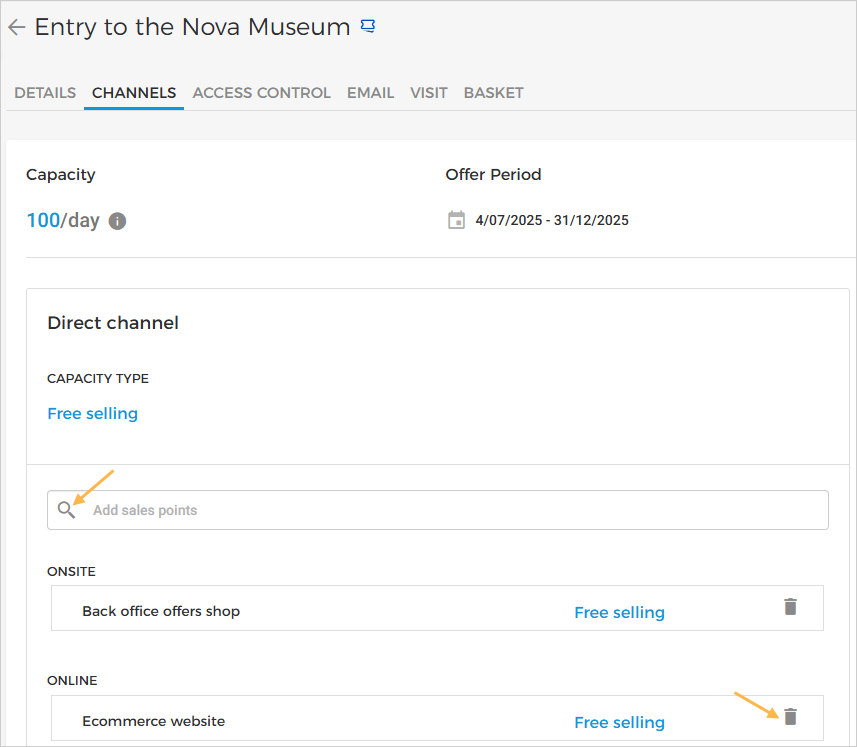 However, if an offer is activated for sales, the direct channel sales points are enabled by default. You can select/deselect these sales points (online and onsite) as needed.