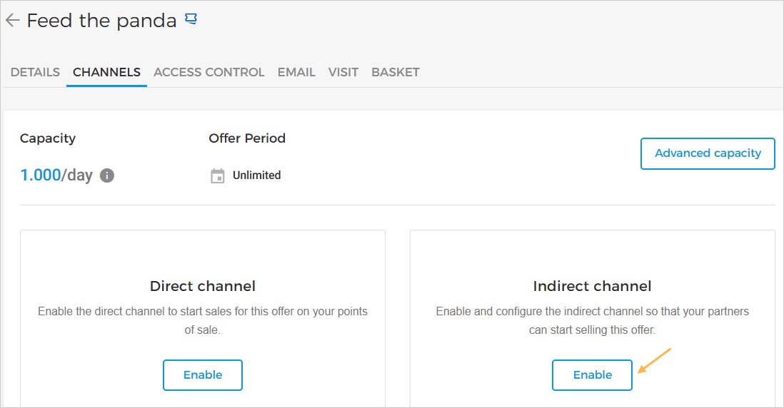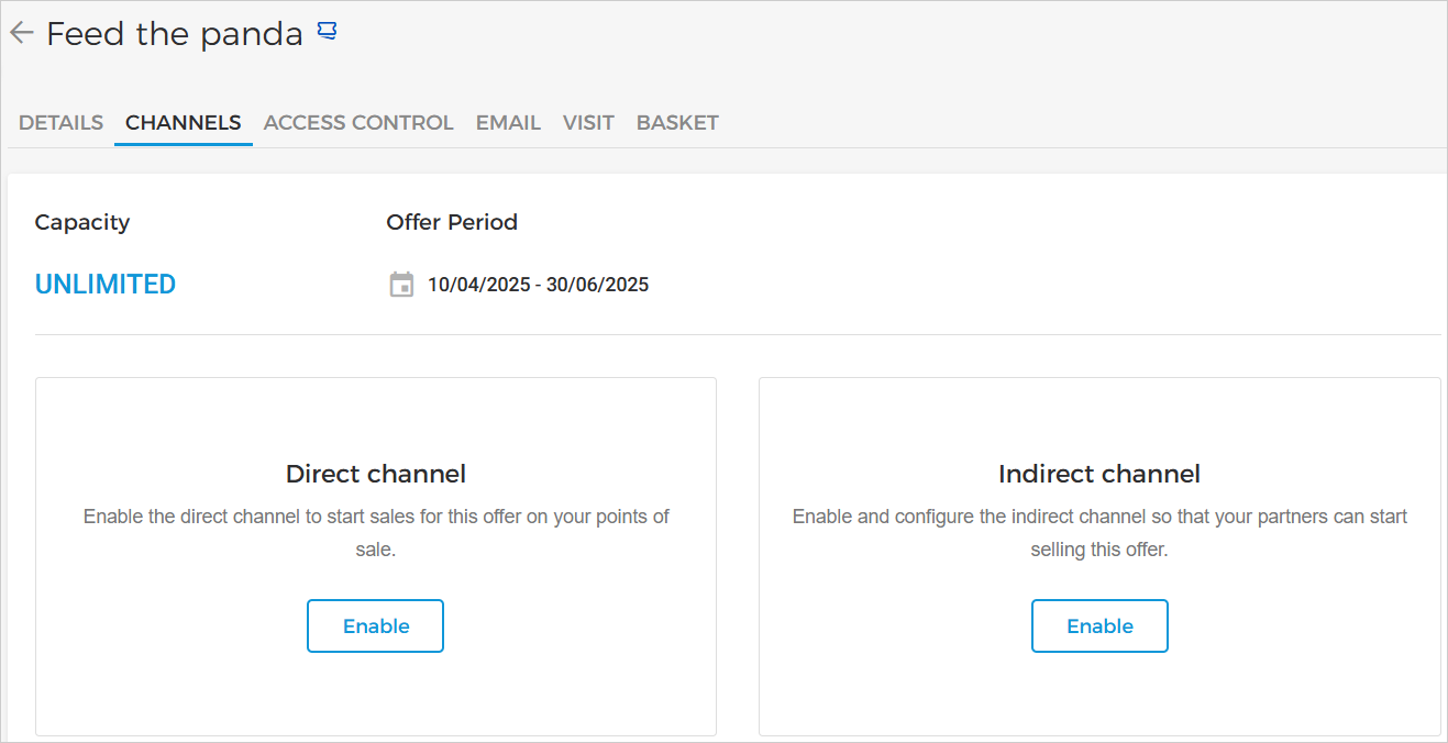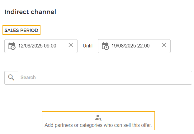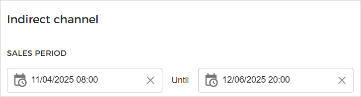 After enabling the Indirect channel, you can configure the offer for reselling by defining its sales period and capacity allocation.